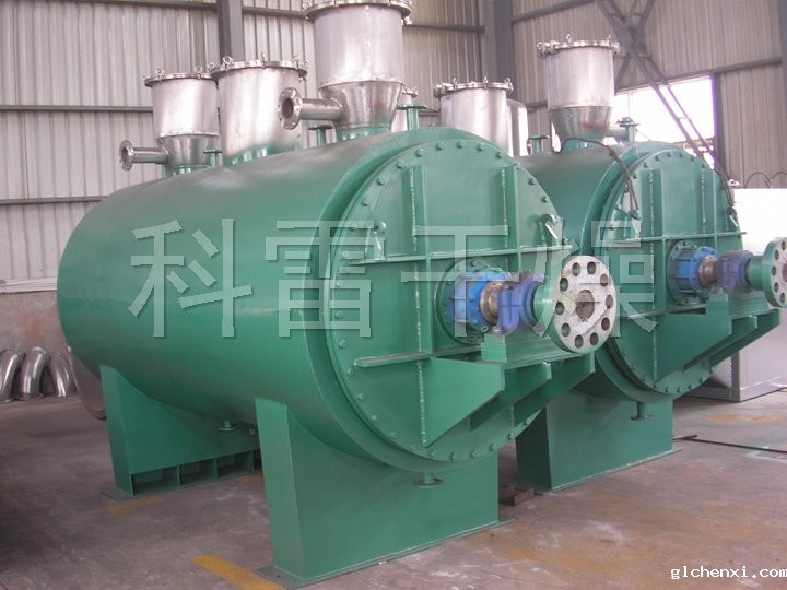 本机是一种新颖卧式间歇式真空干燥设备,湿物料经传导蒸发,带有刮板搅拌器不断清除热面上的物料,并在容器内推移形成循环流,水份蒸发后由真空泵抽出。