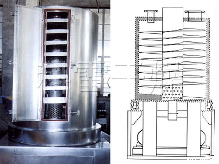 湿物料自顶部加料口进入螺旋床内,在周向激振力及重力的作用下,物料沿螺旋床自上而下作跳跃运动直至^底层;同时,洁净的热风由螺旋床底部进入,与分布在床上的物料进行充分的传热和传质后,由顶部排湿口排出。从而使物料达到了干燥的目的。