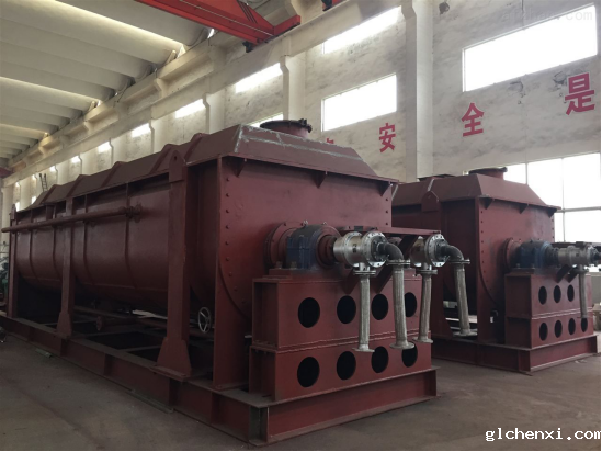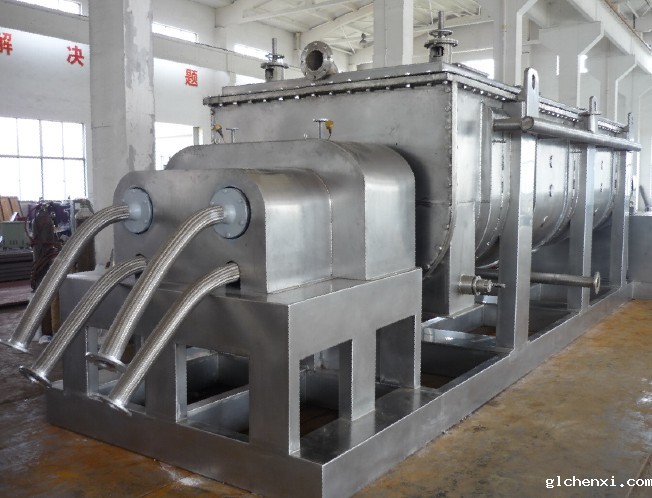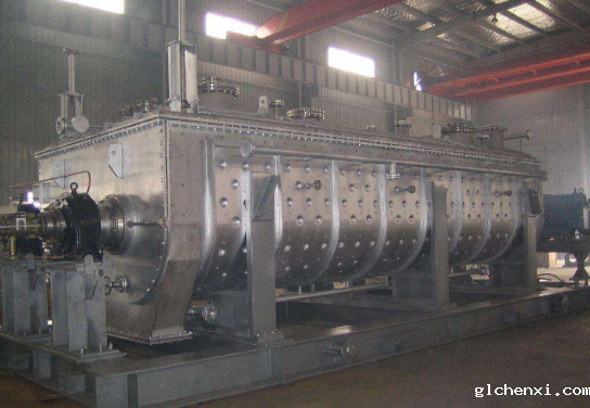 空心轴上密集排列着楔型中空桨叶,热介质经空心轴流经桨叶。单位有效容积内传热面积很大,热介质温度从-40℃到320℃,可以是水蒸汽,也可以是液体型:如热水、导热油等。间接传导加热,没有携带空气带走热量,热量均用来加热物料。热量损失仅为通过器体保温层向环境的散热。楔型浆叶传热面具有自清洁功能。物料颗粒与楔型面的相对运动产生洗刷作用,能够洗刷掉楔型面上附着物料,使运转中一直保持着清洁的传热面。浆叶干燥机的壳体为Ω型,壳体内一般安排二到四根空心搅拌轴。壳体有密封端盖与上盖,防止物料粉尘外泄而充分发挥作用。